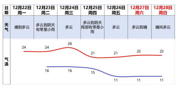 具体而言,展望22日,受弱冷空气影响,晴间多云,气温小幅着落,陆地阵风加大至4级附近,港区和高地阵风6级附近;23日至24日,稀薄小雨转多云,气温回升;25日起,受冷空气捏续补充影响,多云放晴,日夜温差大,夙夜寒凉。市区天气具体预告如下: