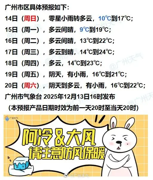 14日,粤北和珠三角北部市县阴天转多云到好天,粤西市县阴天间多云有散布小雨,其余市县散布小雨转多云。最低气温:粤北和珠三角北部市县4~8℃,南部沿海市县13~15℃,其余市县9~12℃。